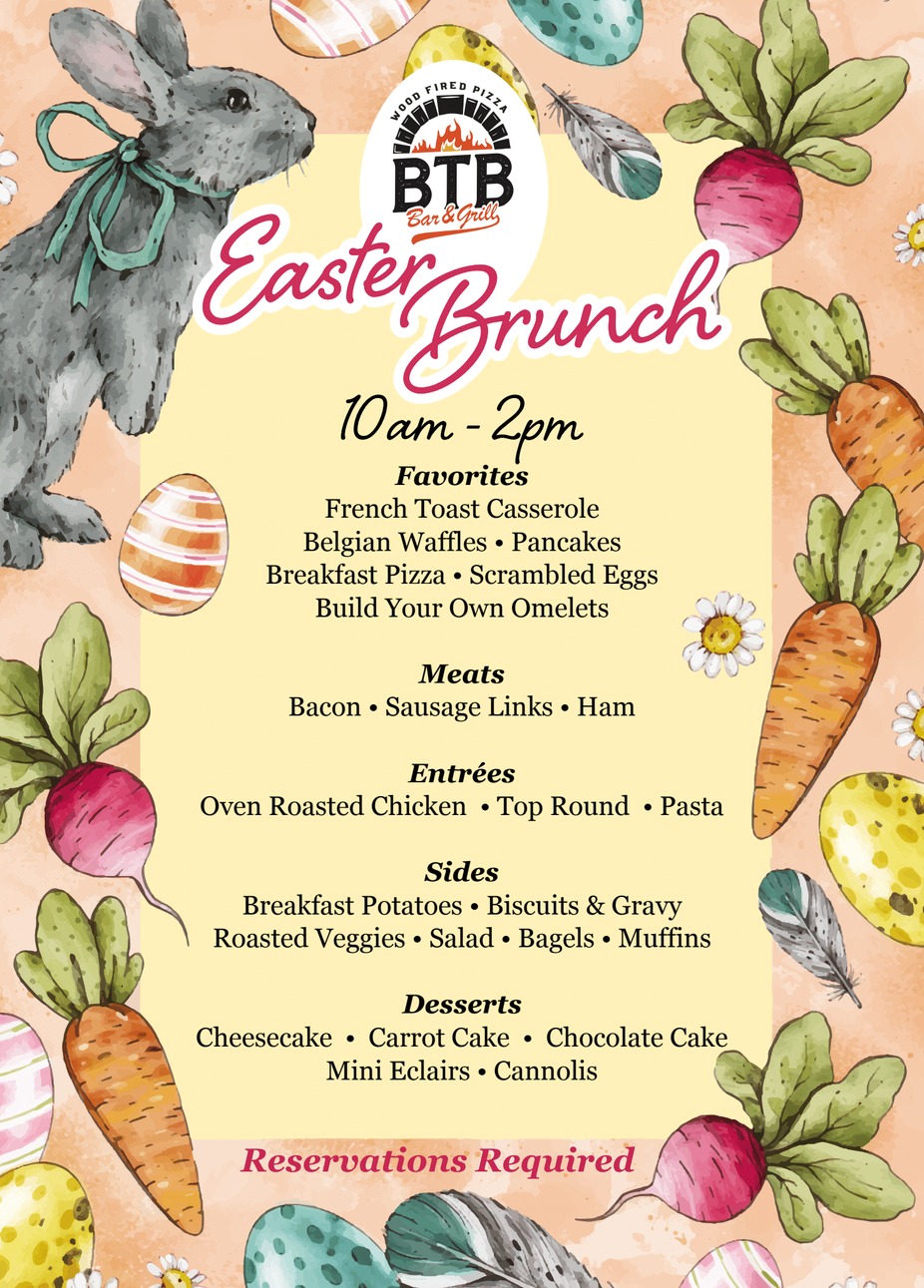 OK, you asked for it and we gave in but we aren't just doing any average buffet, if we are doing a buffet we are going all out! Easter Brunch will run 10-2, plenty of choices and made to order omelets! We took all your suggestions and came up with a menu that will satisfy everyone. If you have a Gluten allergy please contact us before so we can accommodate you as well! Adults $39.95, kids $19.95