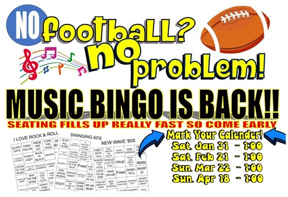 Music Bingo is back, a great way to chase the winter Blues away! Come in, have some food, some drinks and a whole lot of fun! Game starts at 1, please be here by 12:30 to register.