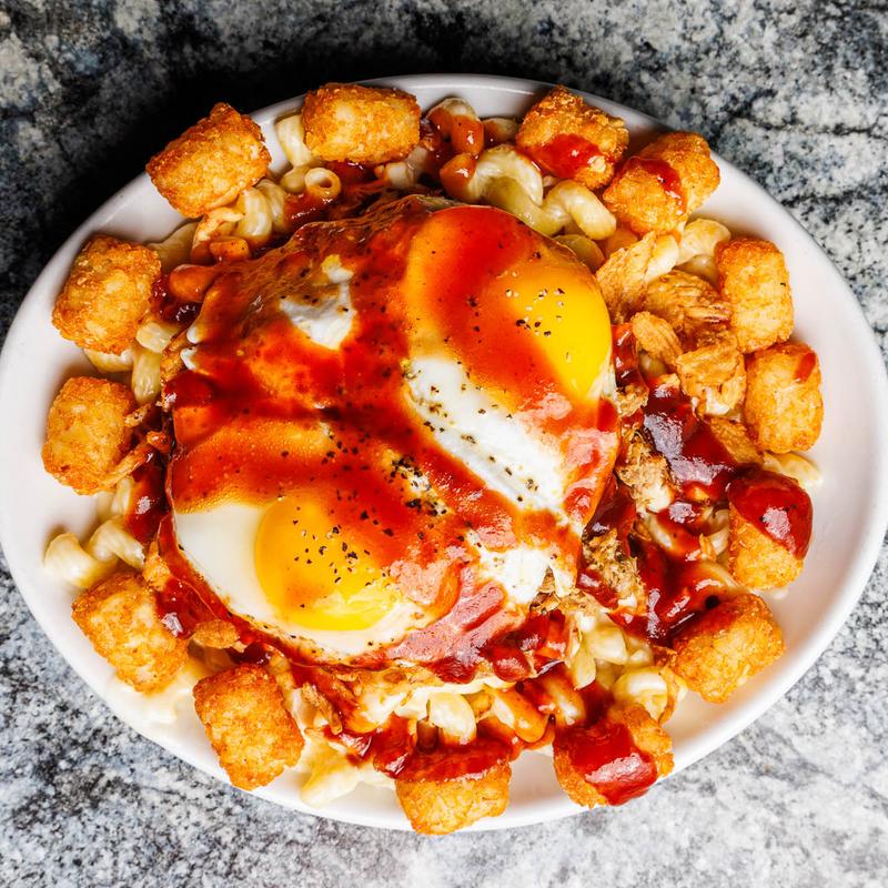 Diced fried chicken, mashed potatoes, roasted corn, smothered in house-made gravy, shredded cheddar, and mixed all together.