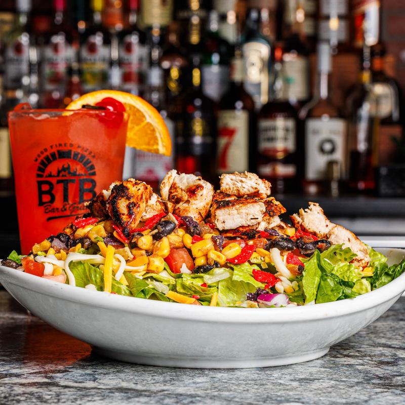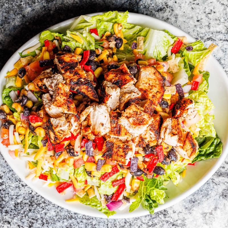 Grilled cajun chicken, romaine, tomatoes, red onion, banana peppers, & shredded cheddar with your choice of dressing